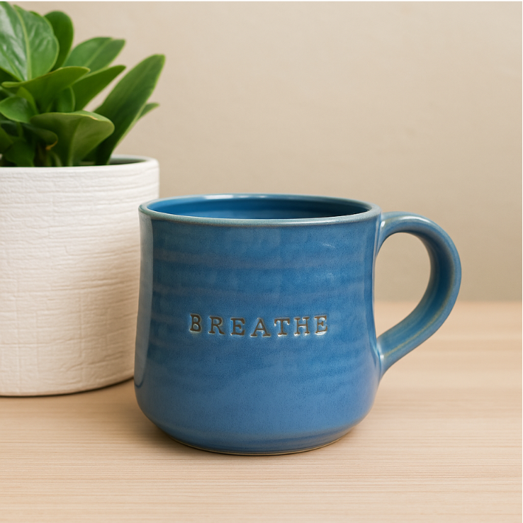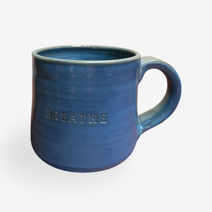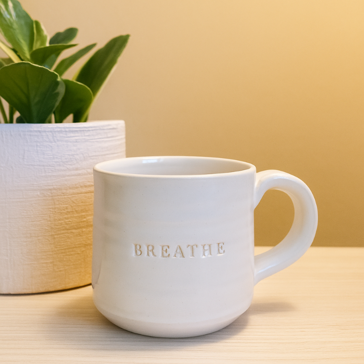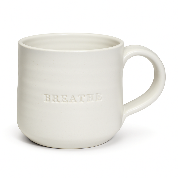 Beautifully handcrafted white clay mug that features a light glaze and a debossed logo that reads "Breathe." Top rack dishwasher and microwave safe.